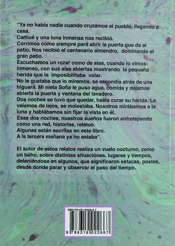 Colección de relatos situados en Carhué. El autor de estos relatos realiza un vuelo nocturno, como un Búho, sobre distintas situaciones, lugares y épocas, deteniéndose en algunos, que significaron estacas, postes, desde donde parar y observar el paso del tiempo.